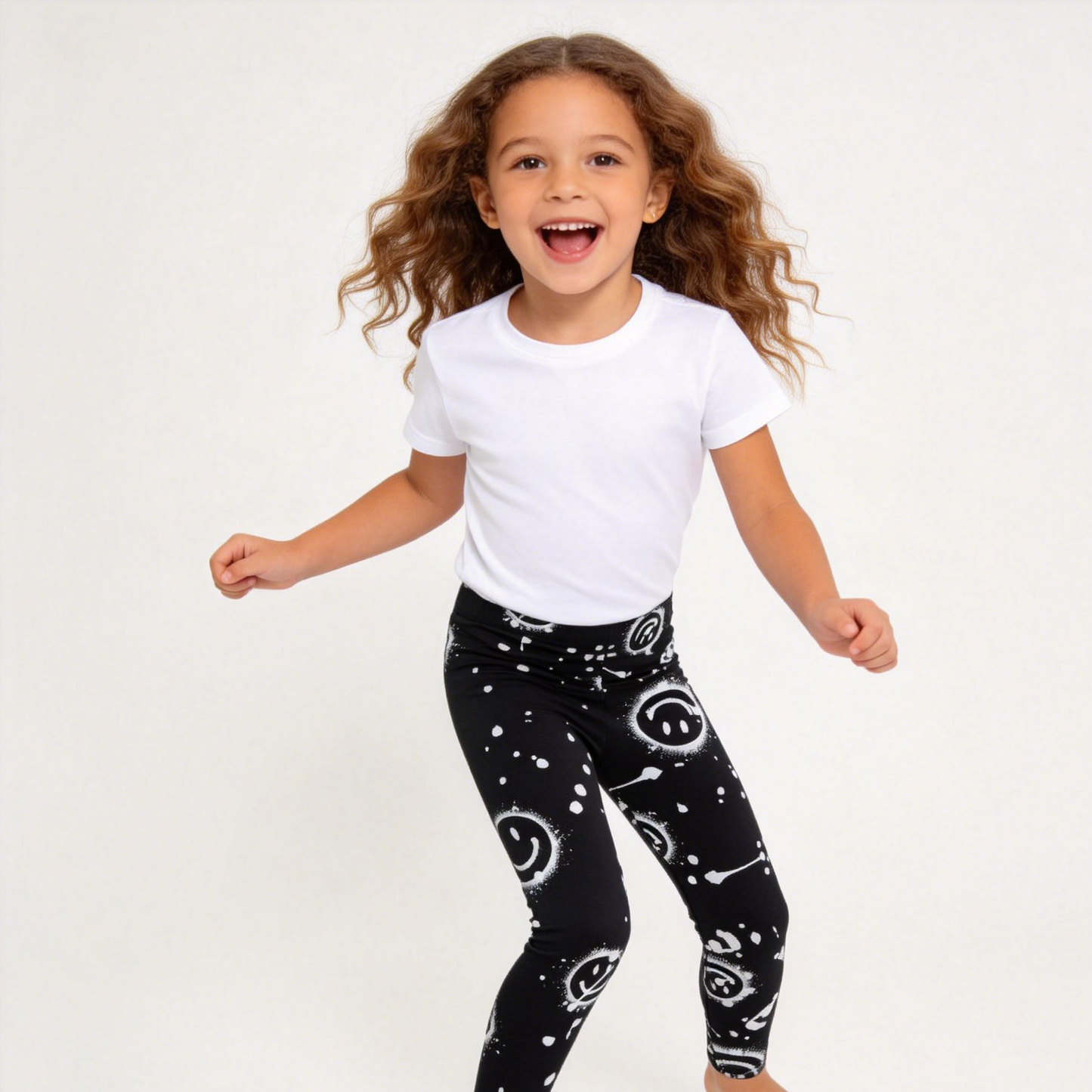 Girls' Splatter Smiley Face Leggings, Black & White Soft Cotton Blend Kids' Tights, Streetwear-Inspired Children's Bottoms, Playful Smiley Print Toddler Pants, Comfortable Kids' Activewear
