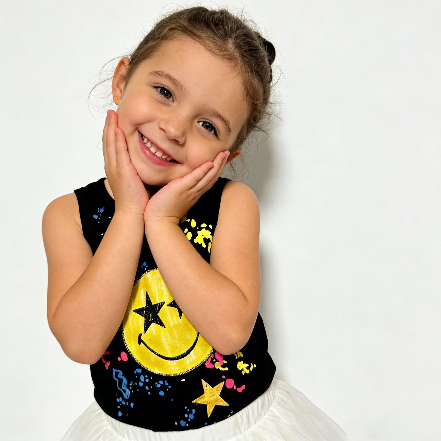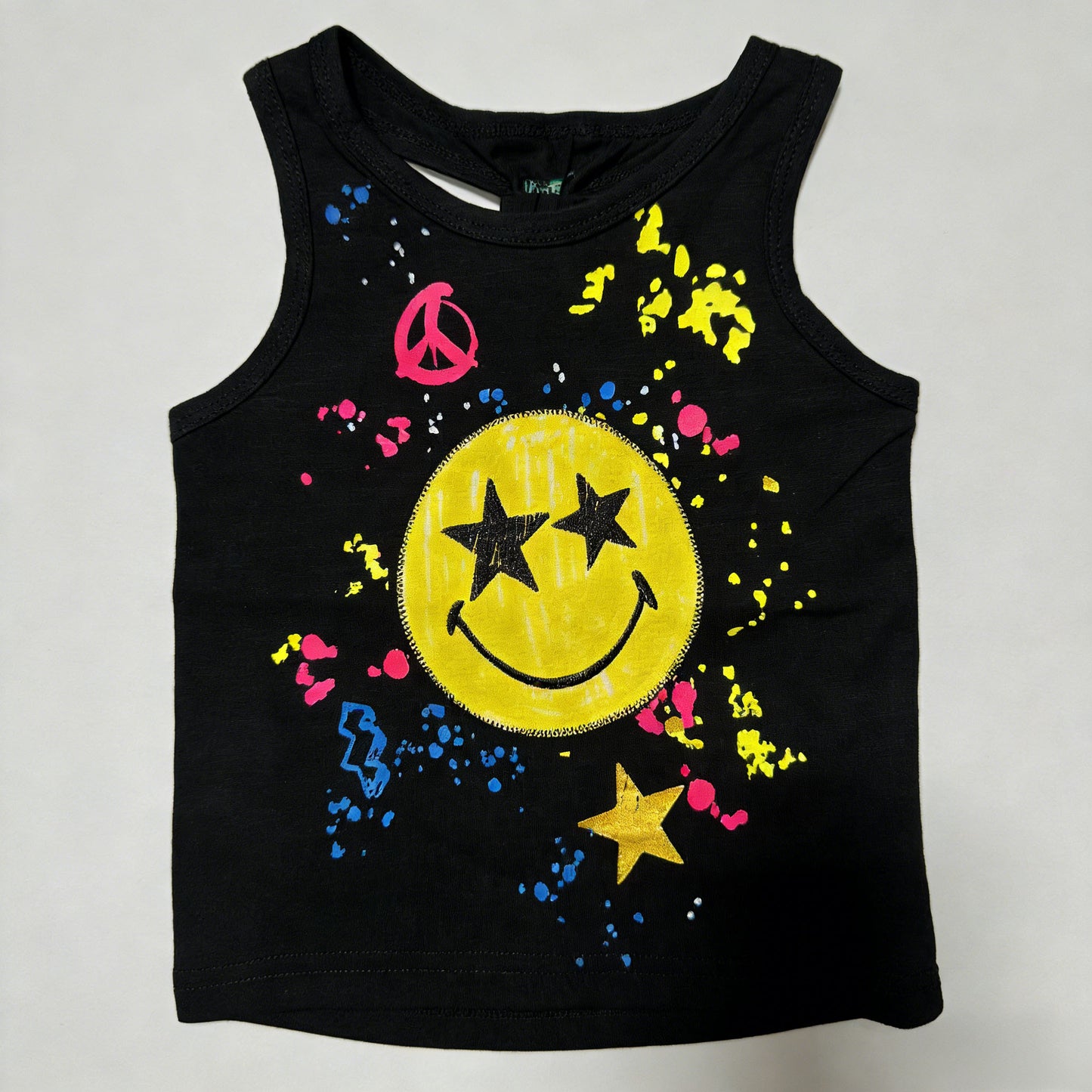 Kapital K Girls Black Star Eyes Smile Graffiti Tank Top, 3/6m-7, Sleeveless Top with Peace Sign & Color Splatter Print