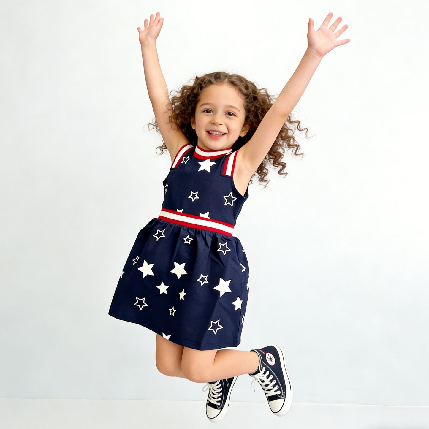 This dress features a classic navy blue base covered in bright white stars, evoking a patriotic spirit perfect for holidays, summer gatherings, and special days. The sleeveless design is accented with retro-inspired red and white striped trim at the mock neck and waist, creating a preppy, put-together look that’s both adorable and on-trend. The A-line skirt provides plenty of room for twirling and play, making it as practical as it is stylish.