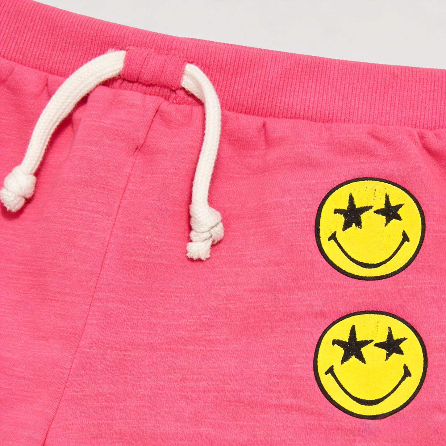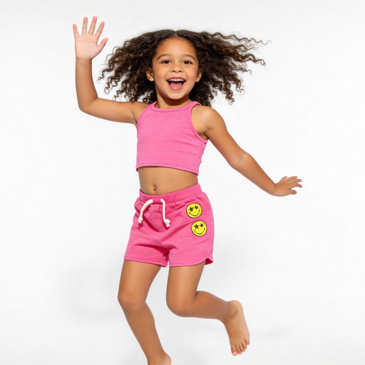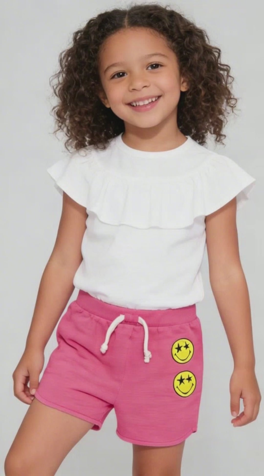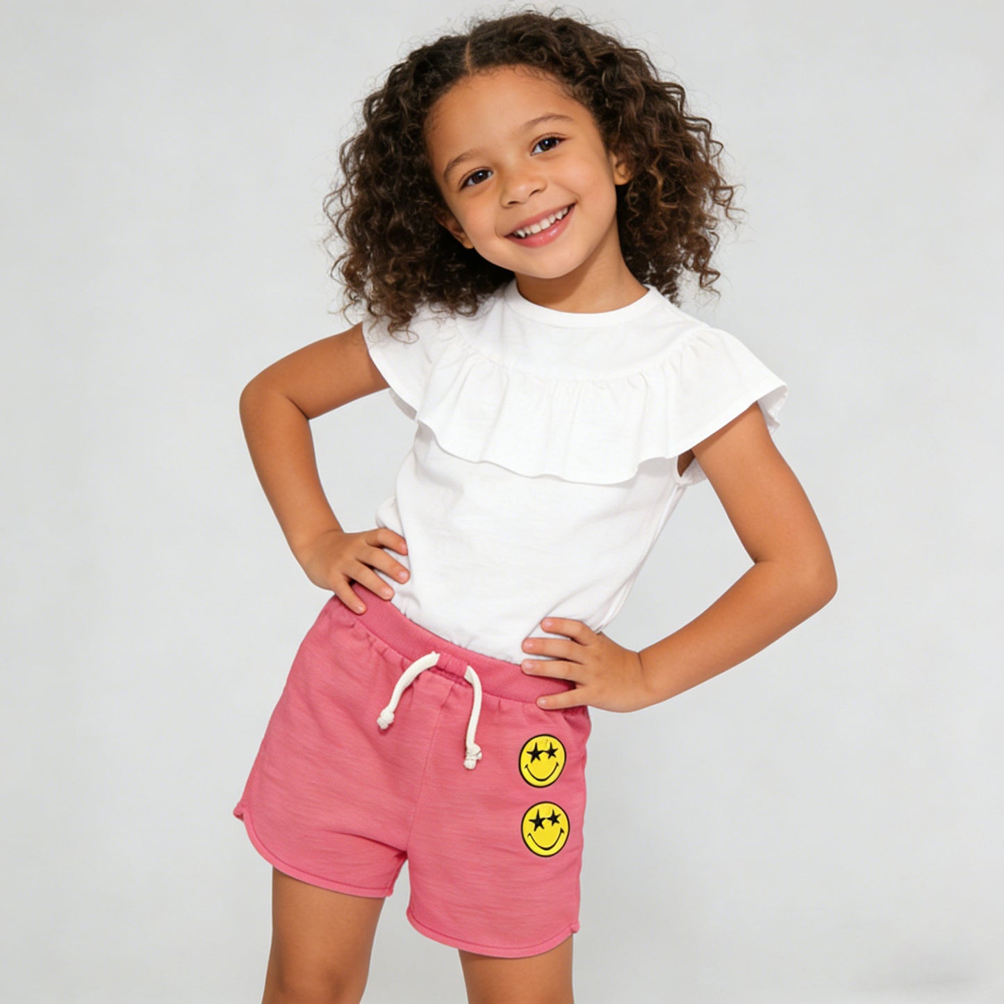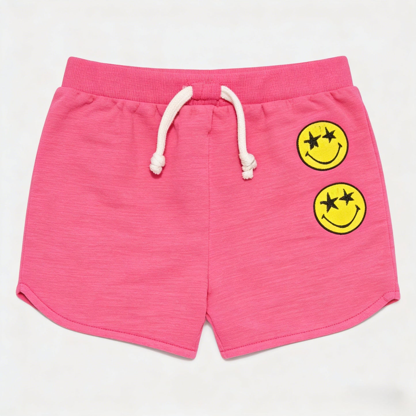 Kapital K Girls Pink Star Eyes Smile Shorts, 2T-6X, Bright Pink Cotton Shorts with Yellow Patches, Casual Toddler Girl Summer Playwear
