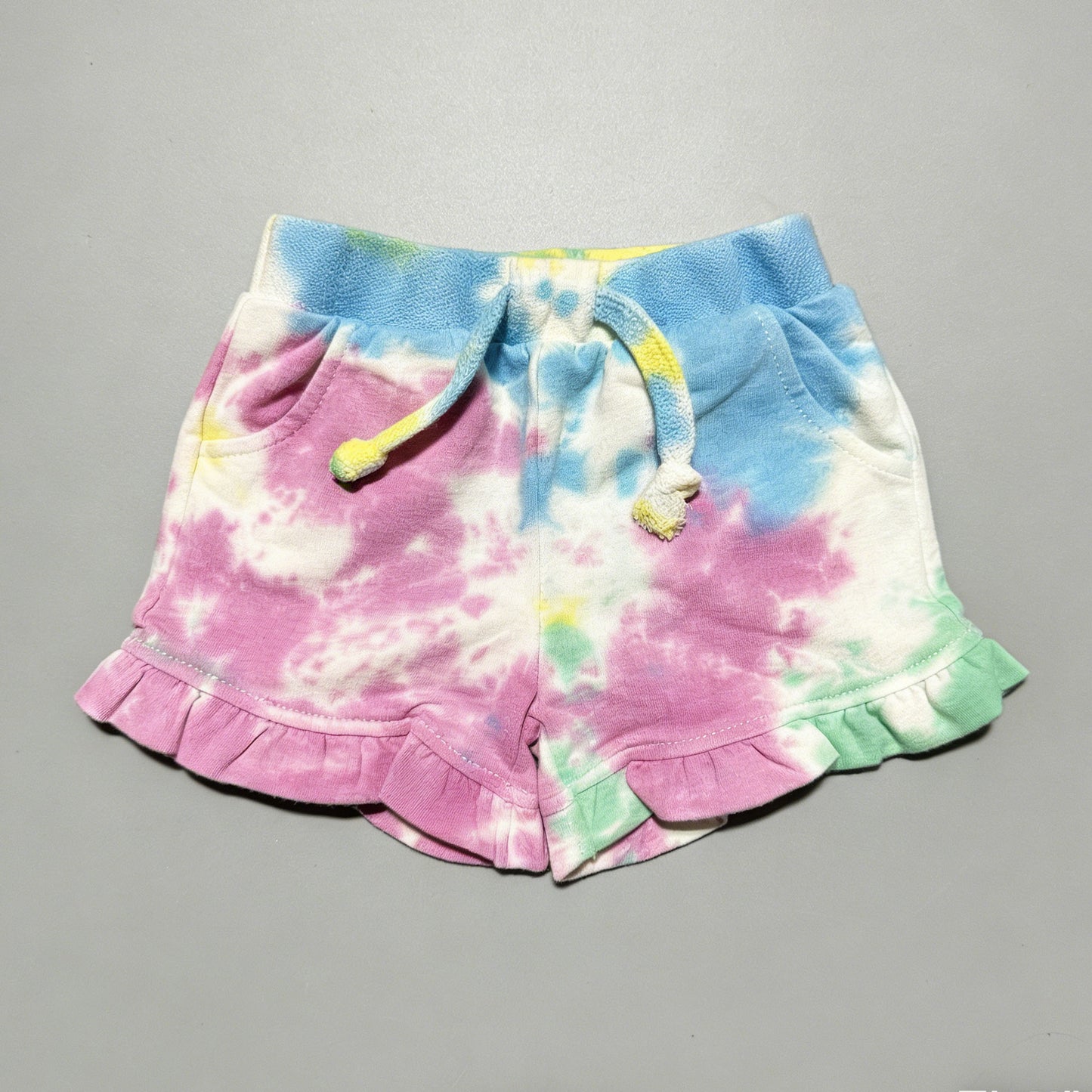 Kapital K Girls Pastel Tie-Dye Ruffle Shorts, 3/6m-4T, Colorful French Terry Shorts with Drawstring