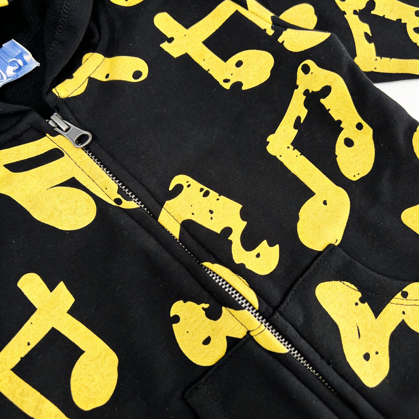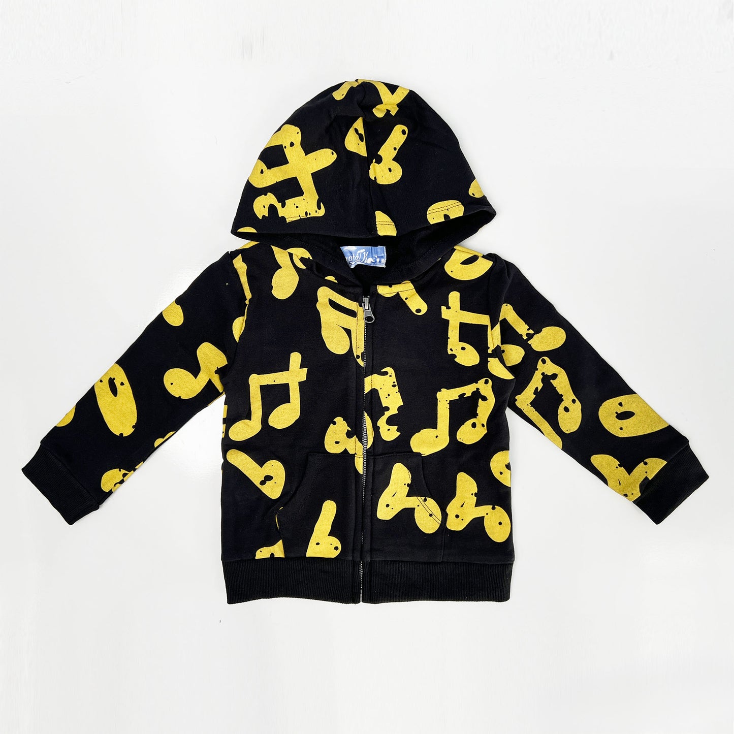 Kapital K Girls Black Yellow Music Note Zip-Up Hoodie, 2T-4, All-Over Print Hooded Sweatshirt, Toddler Full-Zip Jacket with Music Notes