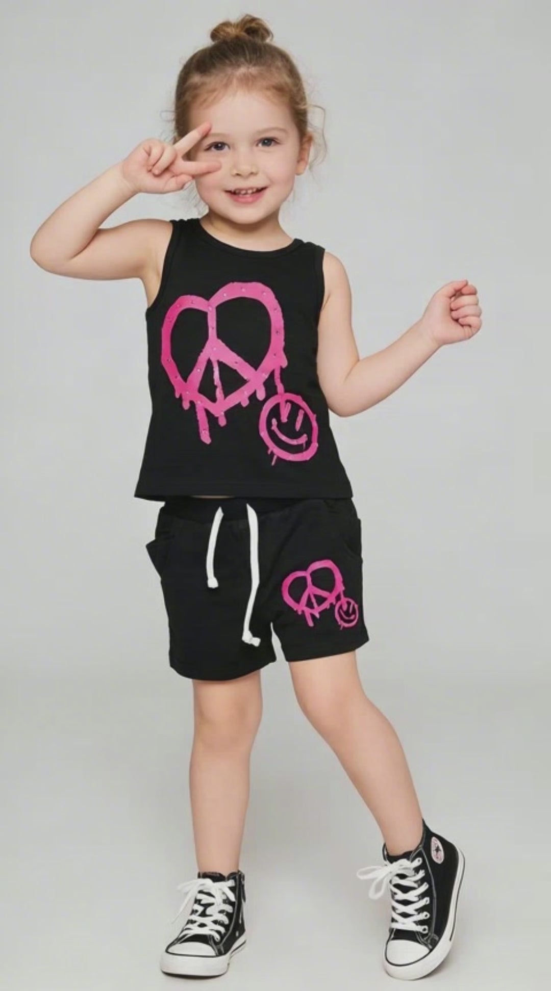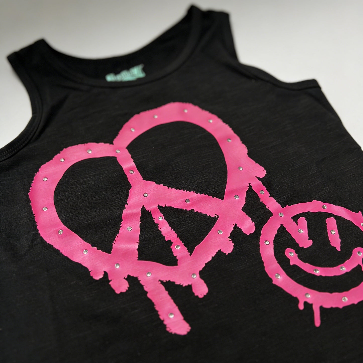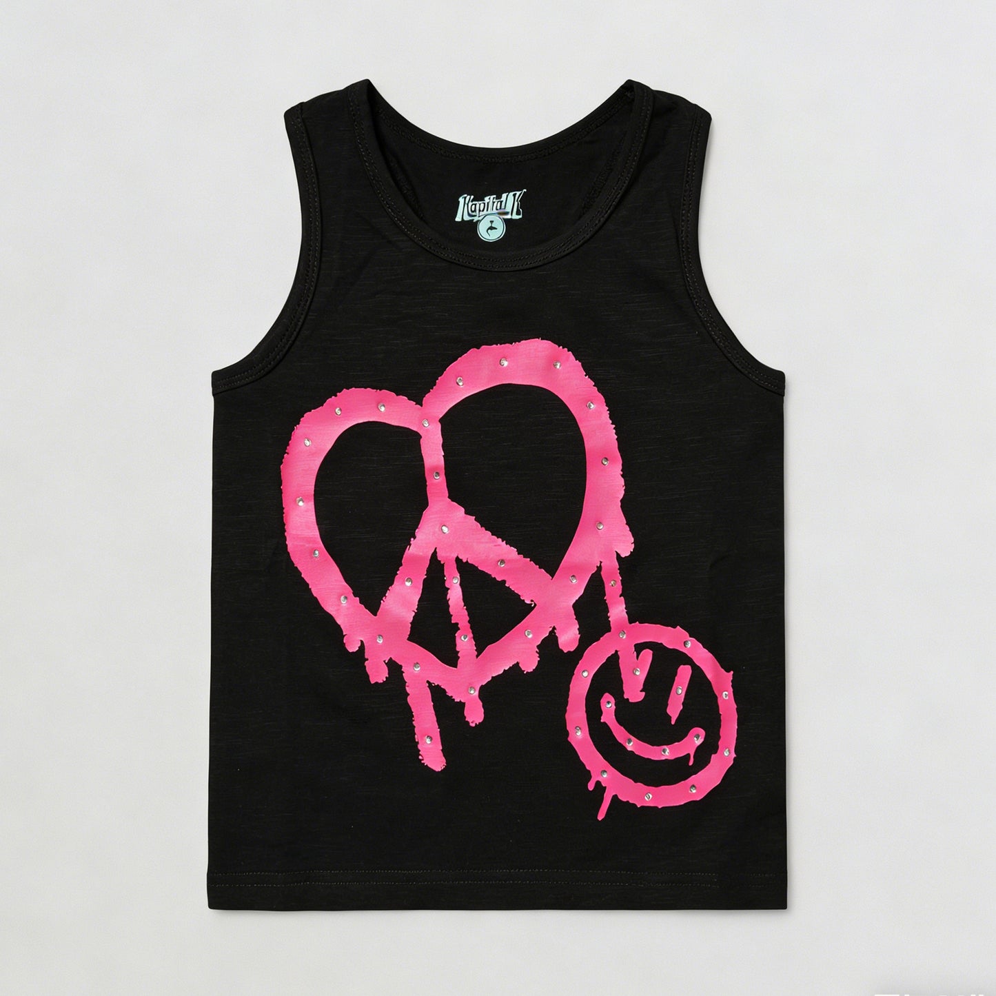 Kapital K Girls Black Rhinestone Peace Heart Smile Tank Top, 12m-6X, Sleeveless Cotton Tank with Pink Graffiti Graphic