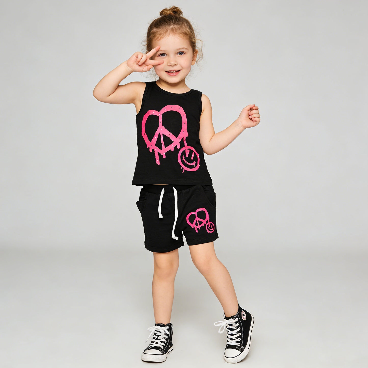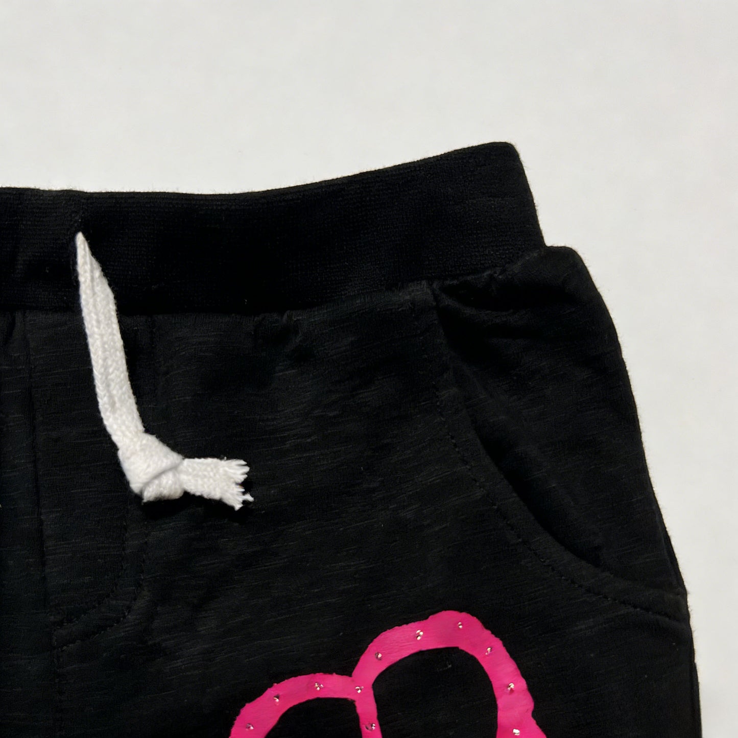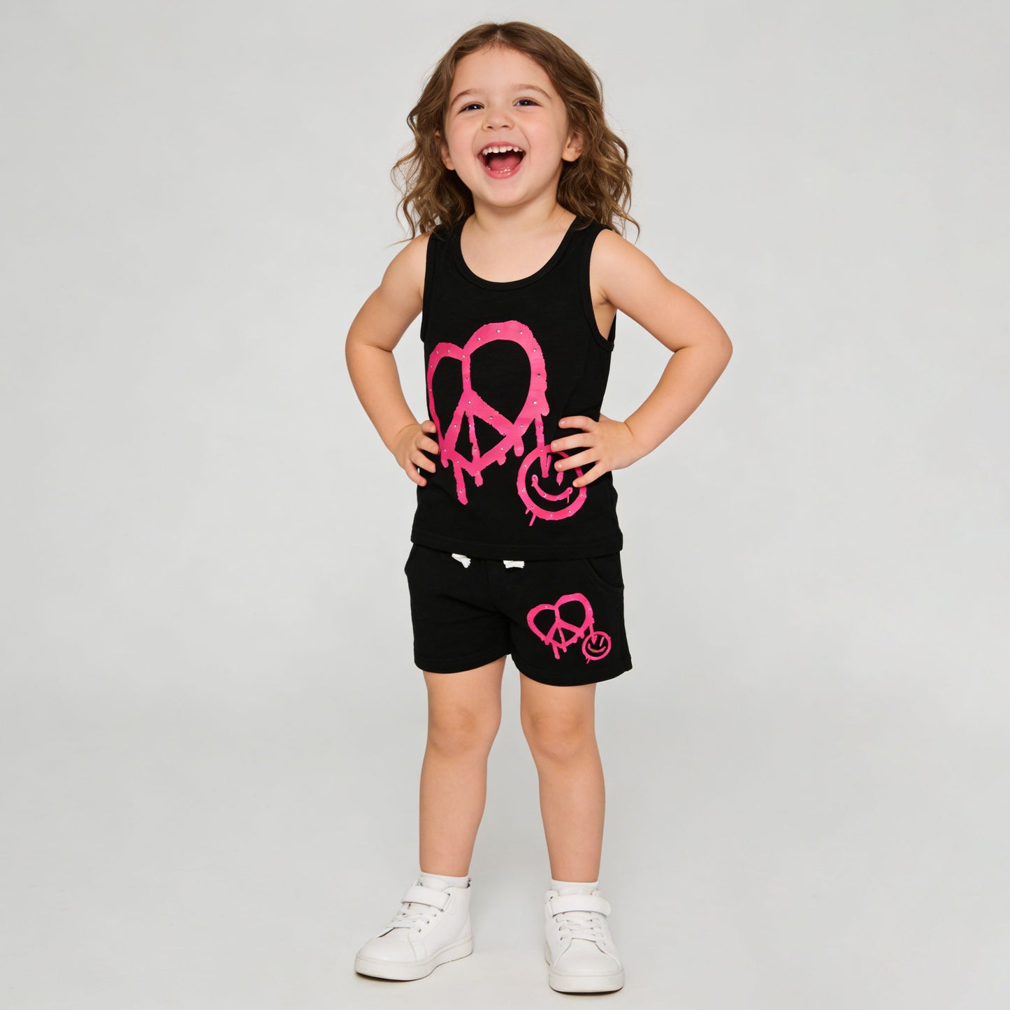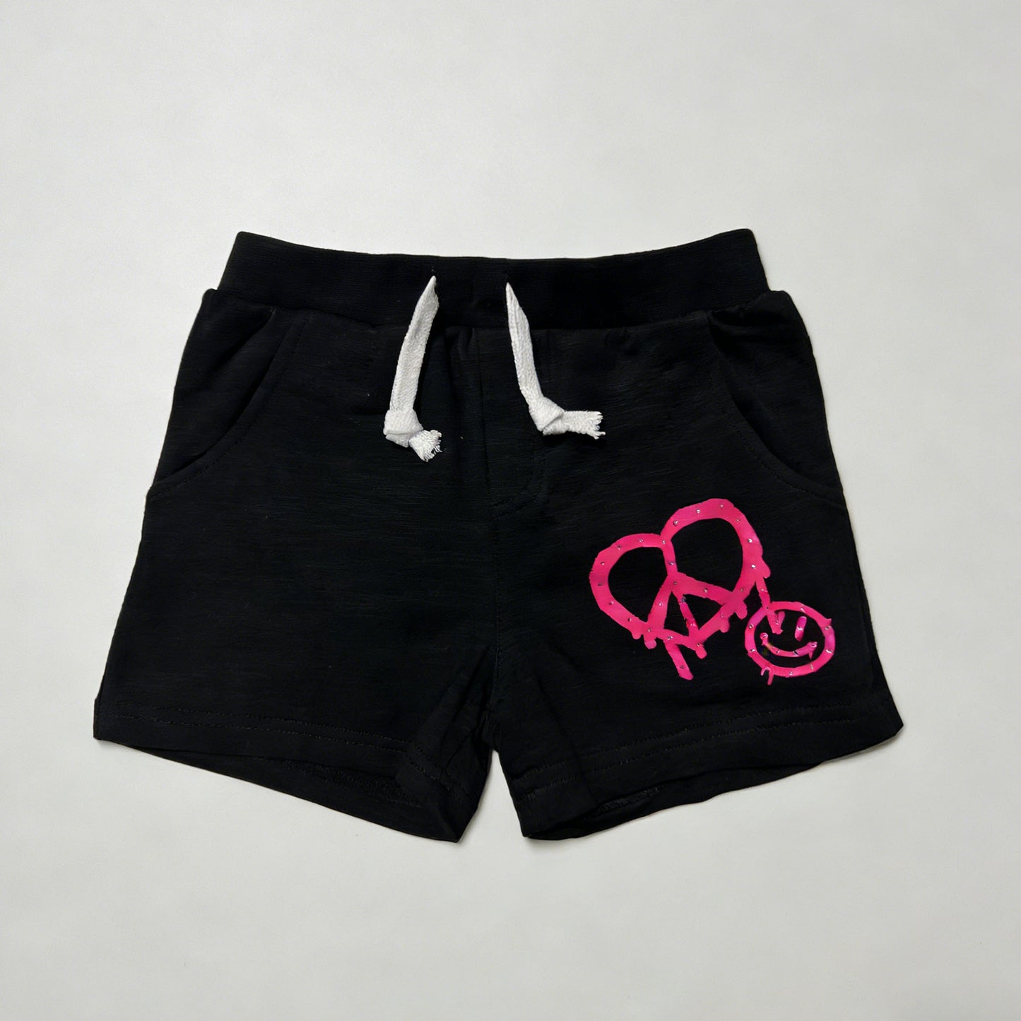 These black French terry shorts feature a vibrant pink graphic on the leg: a peace sign formed into a heart, with a tiny smiley face and subtle rhinestone accents for a playful, edgy look. The elastic waist with white drawstring offers a comfortable, adjustable fit, while side pockets add practicality for storing small treasures.