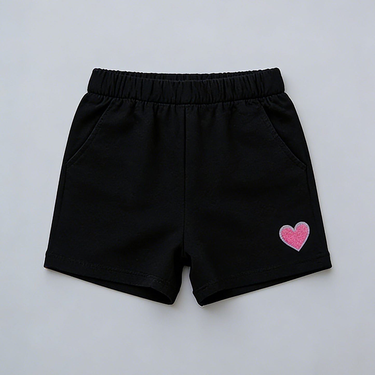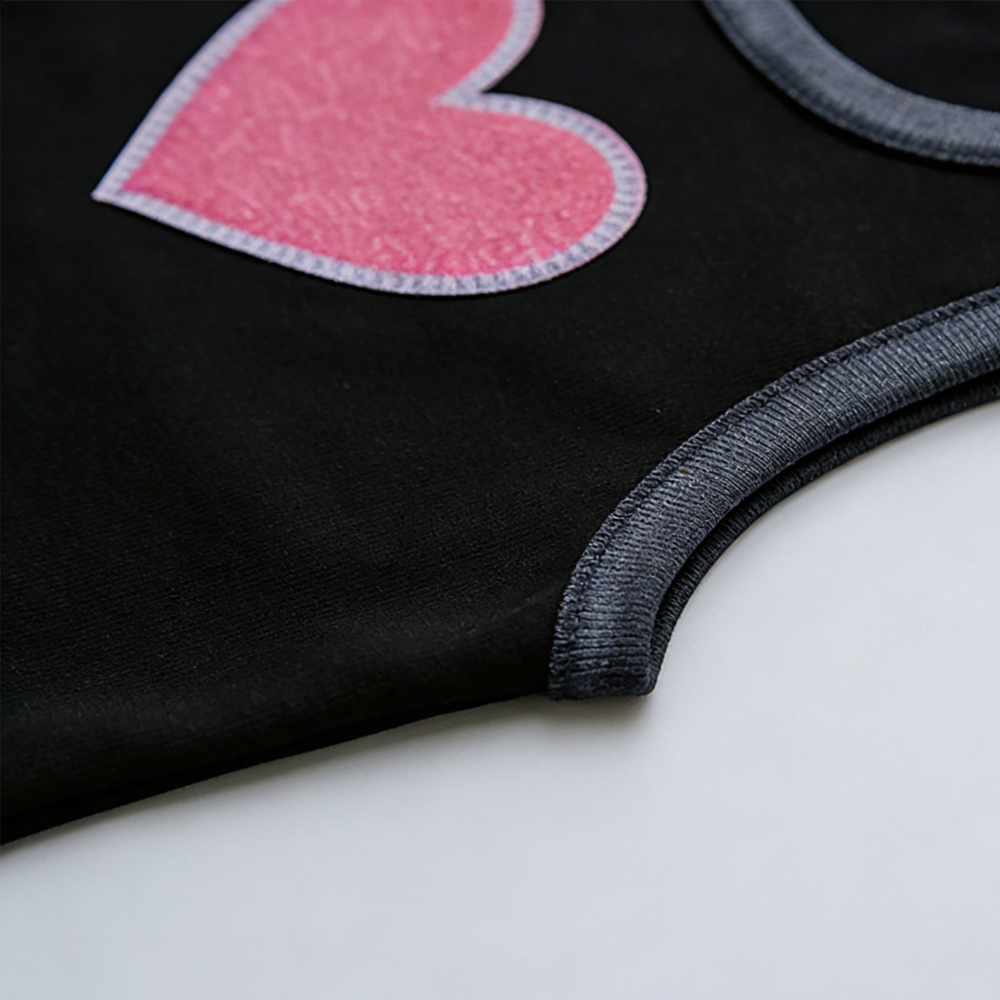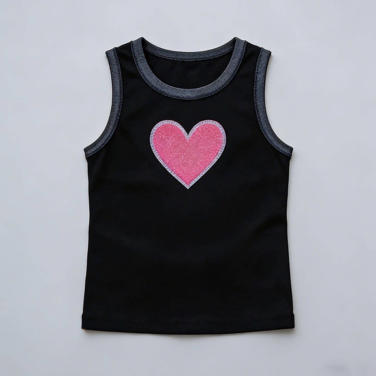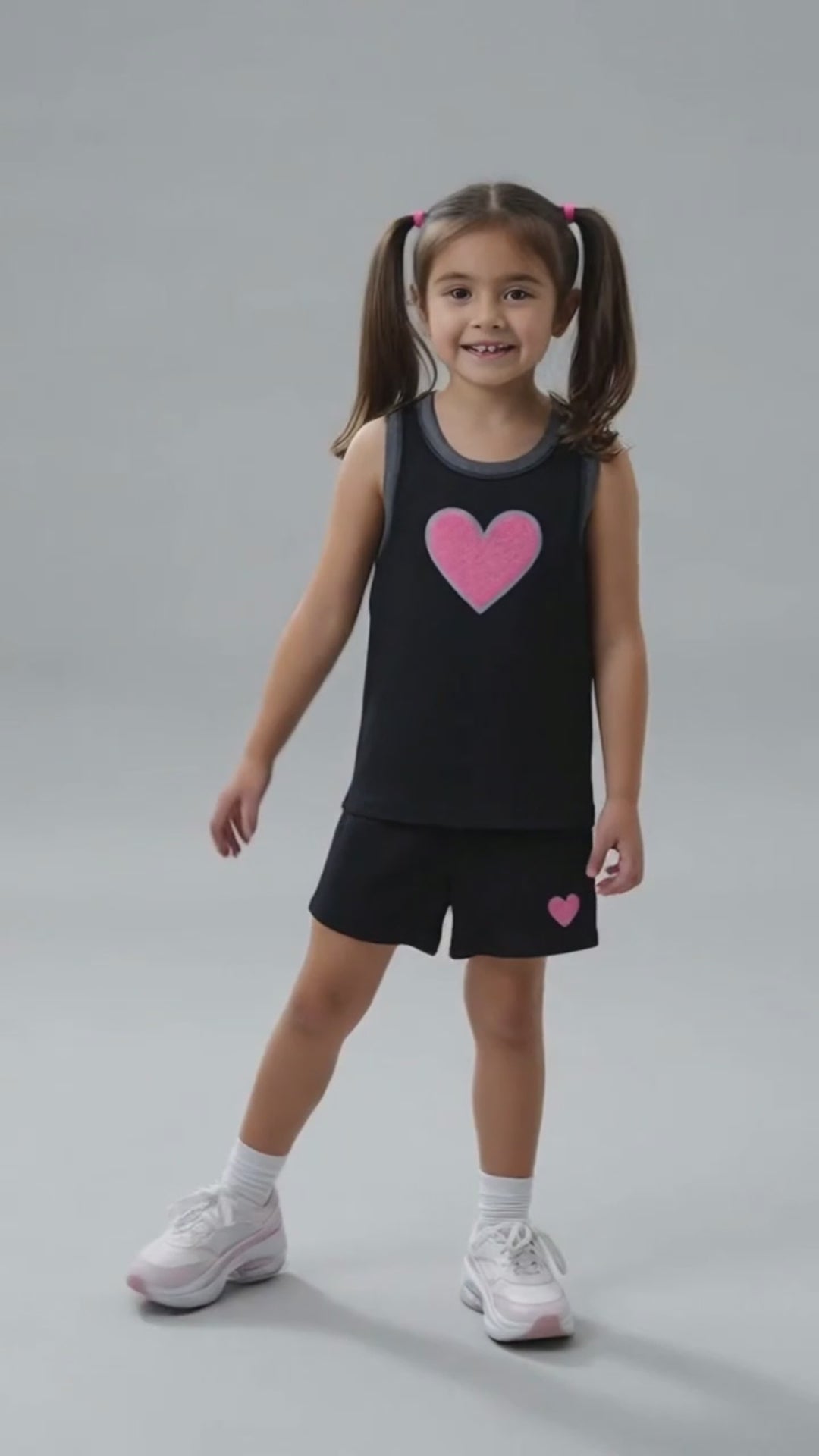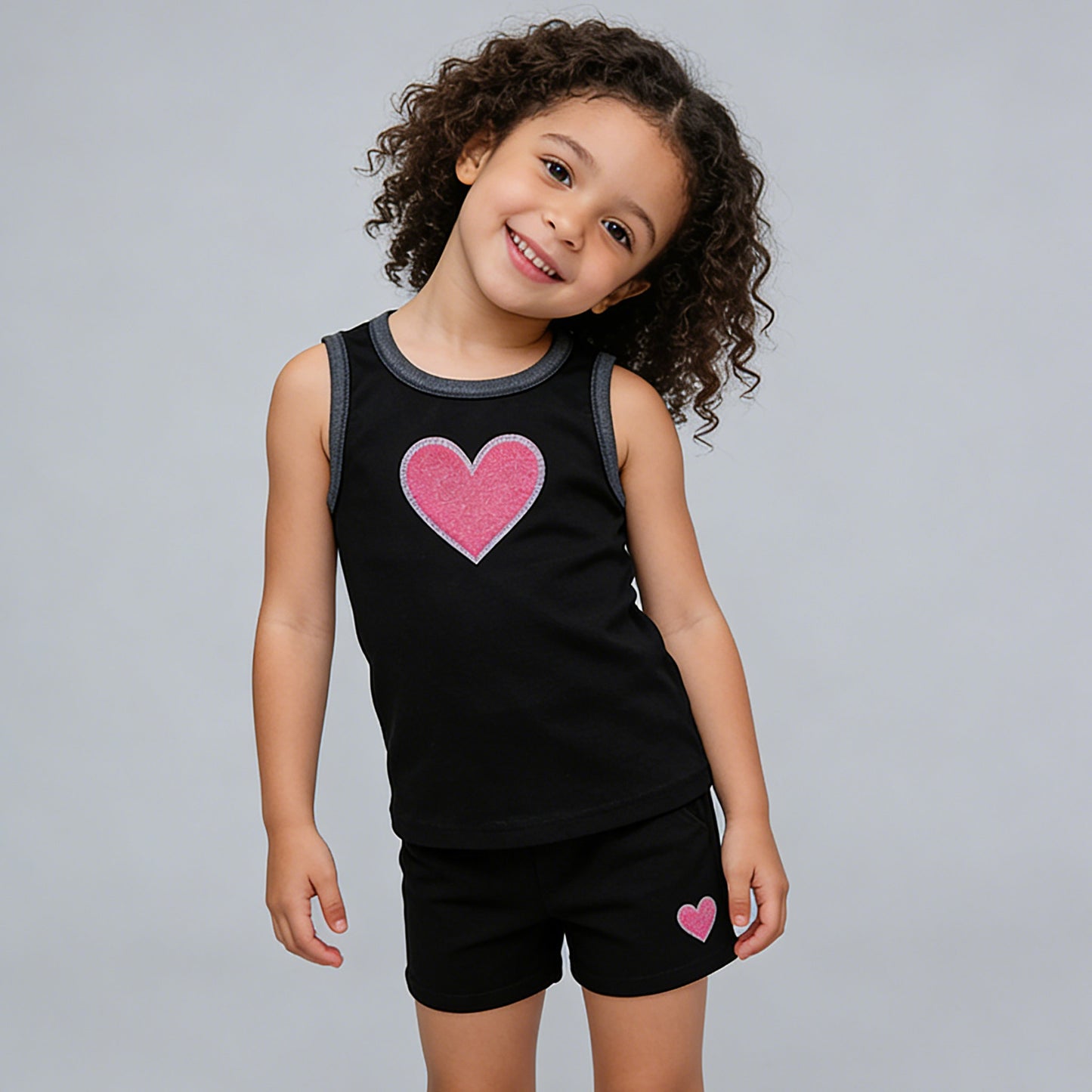 - Playful Heart Accents: Large pink heart patch on tank + tiny heart detail on shorts add sweet charm