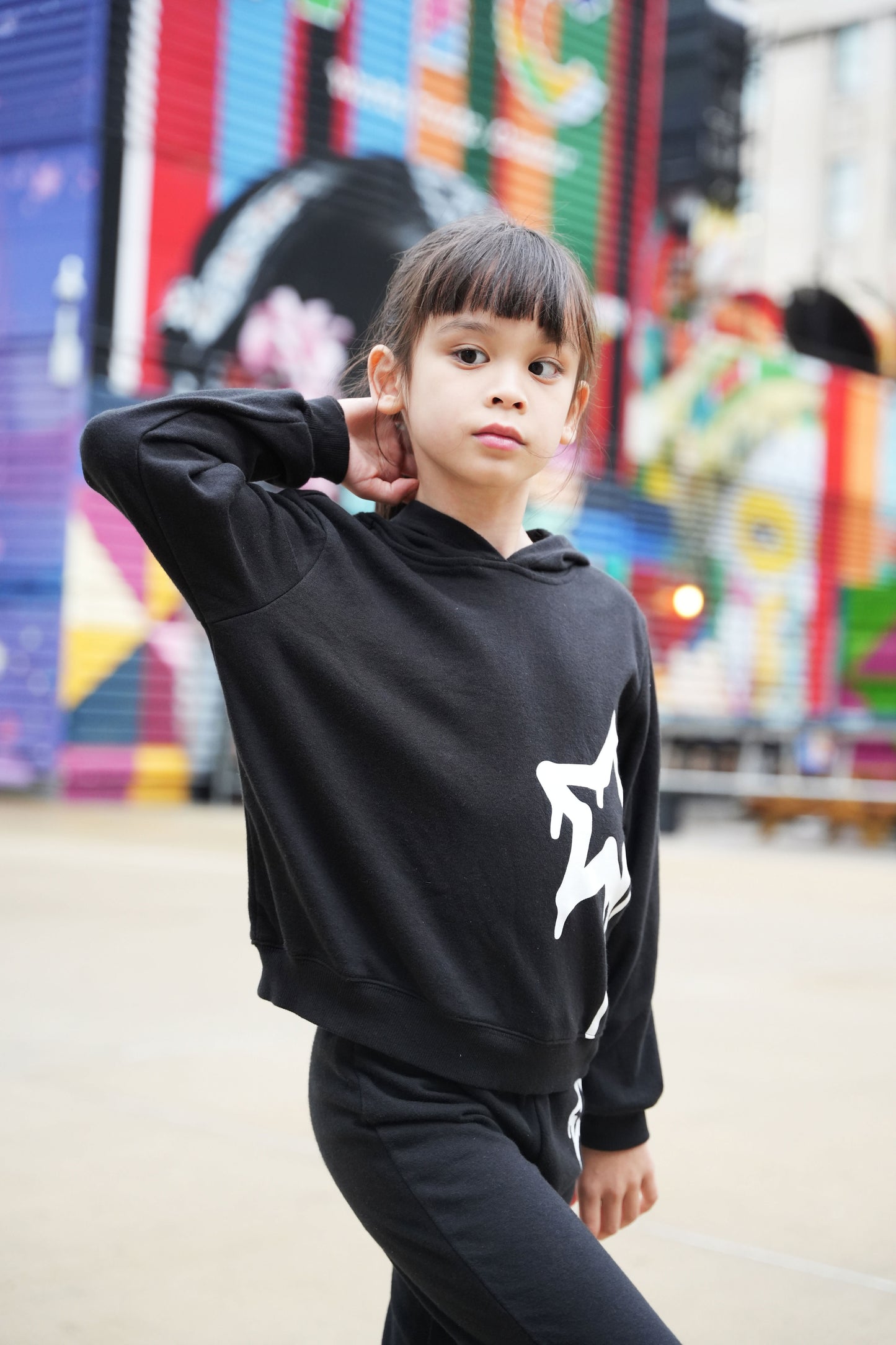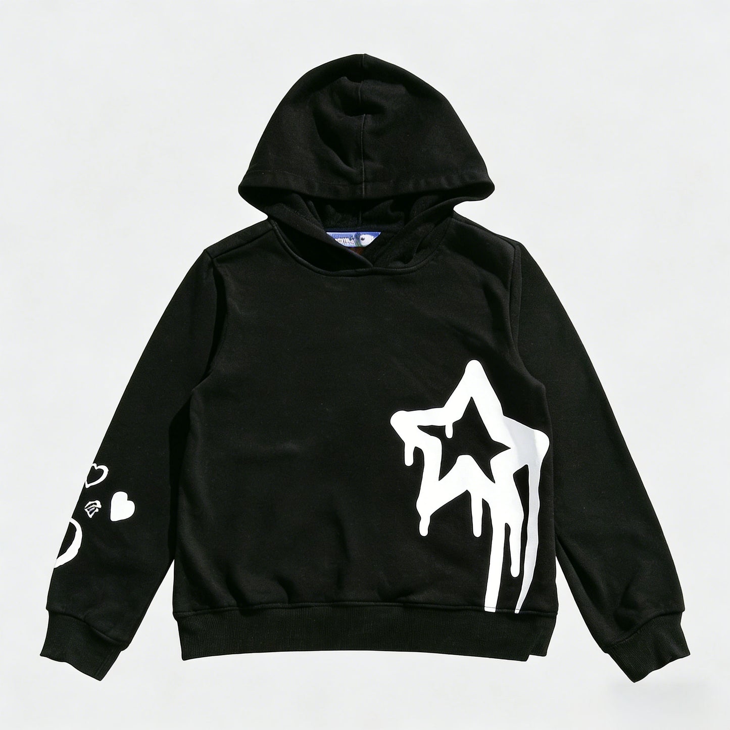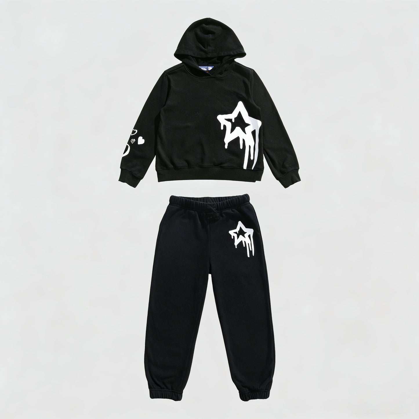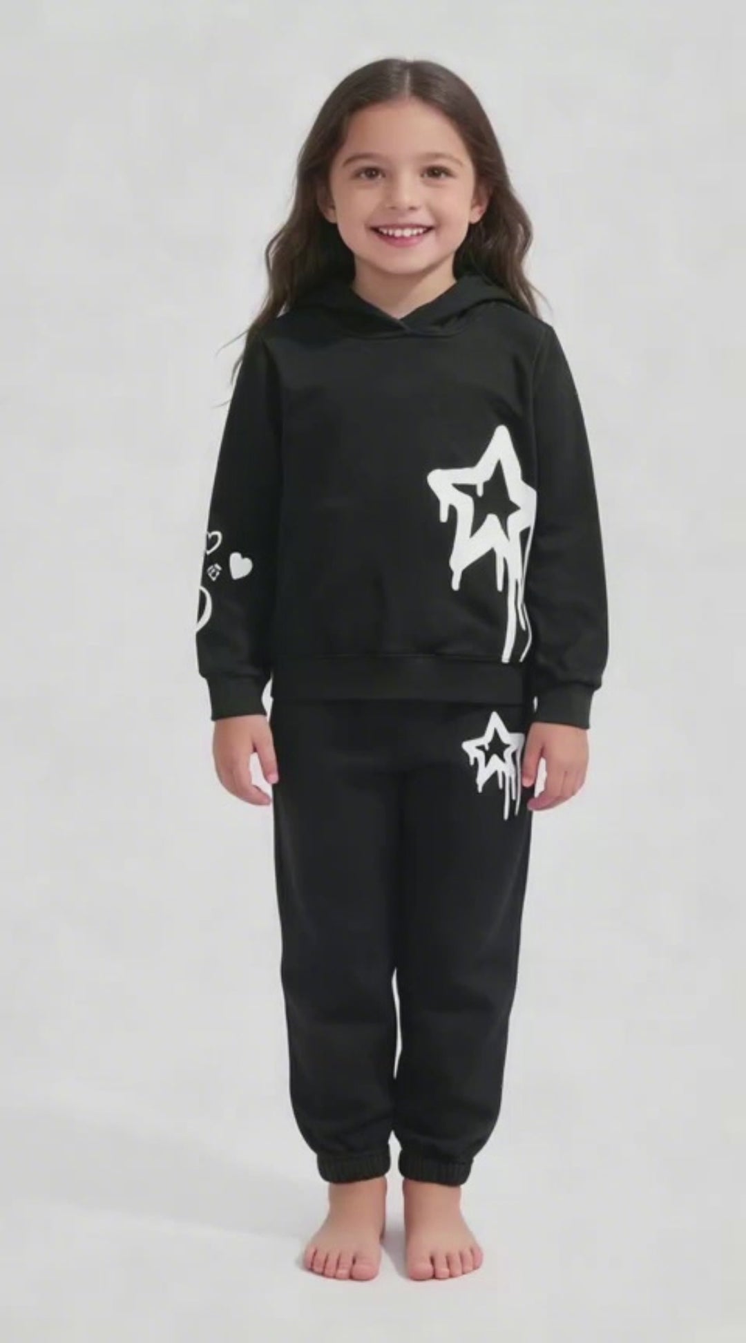 The black hooded sweatshirt features a bold white star with a playful drip effect on the front, plus matching white heart and mini symbol details on the sleeve for subtle flair. Coordinating black joggers mirror the star drip print on the leg, creating a cohesive, head-turning look kids love. The classic pullover hoodie with ribbed cuffs and hem, paired with tapered joggers, offers a relaxed fit perfect for all-day movement.