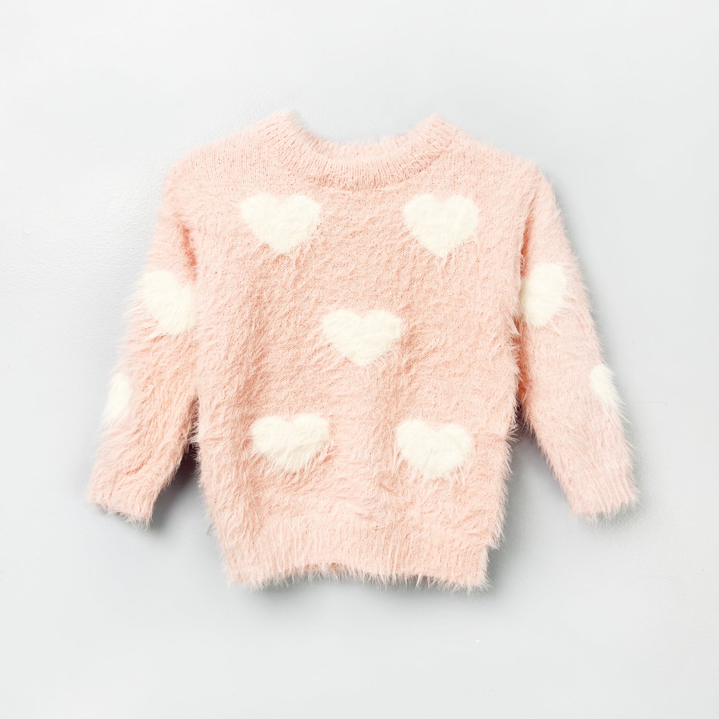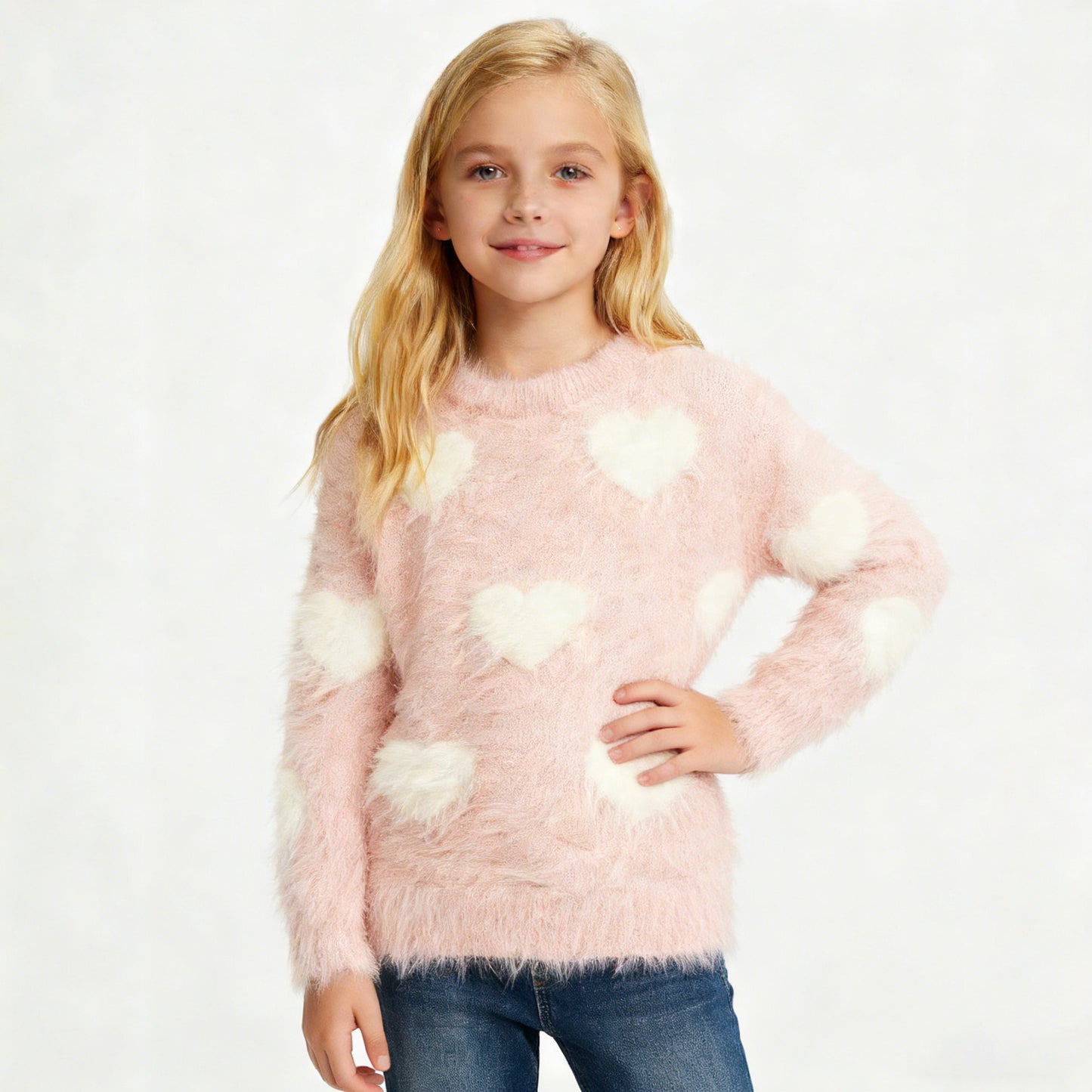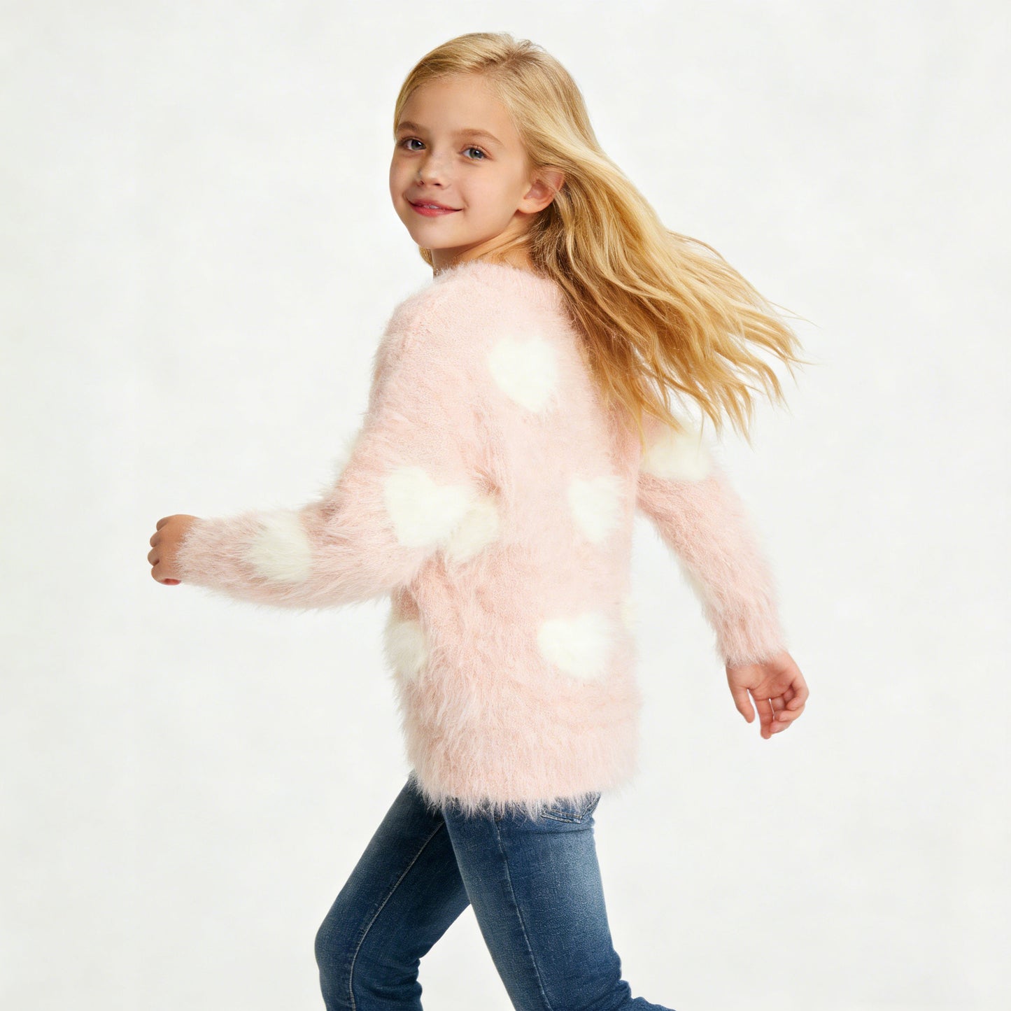 Girls' Fuzzy Heart Print Sweater, Pink & White Soft Plush Knit Top, Kids Cozy Winter Pullover, Cute Heart Pattern Sweatshirt, Toddler & Girls Warm Casual Apparel
