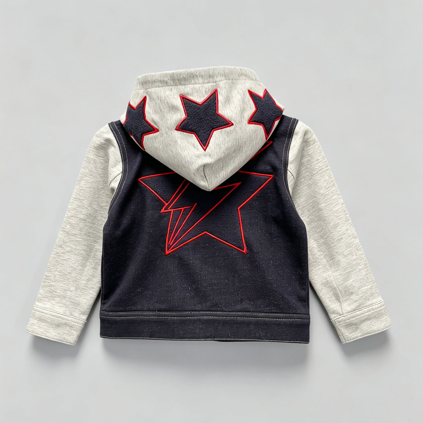 Regular price $16.75In the electric pulse of Times Square, where billboards blaze and the city never sleeps, a young boy strides confidently through the crowd. His knit denim hoodie jacket catches the light—bold navy stars outlined in red crown his hood, while a striking lightning-star design blazes across his back like a superhero’s insignia.