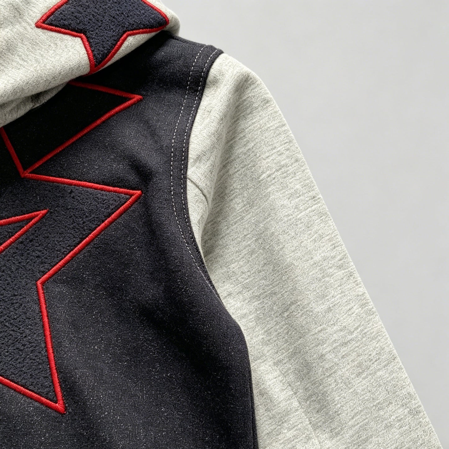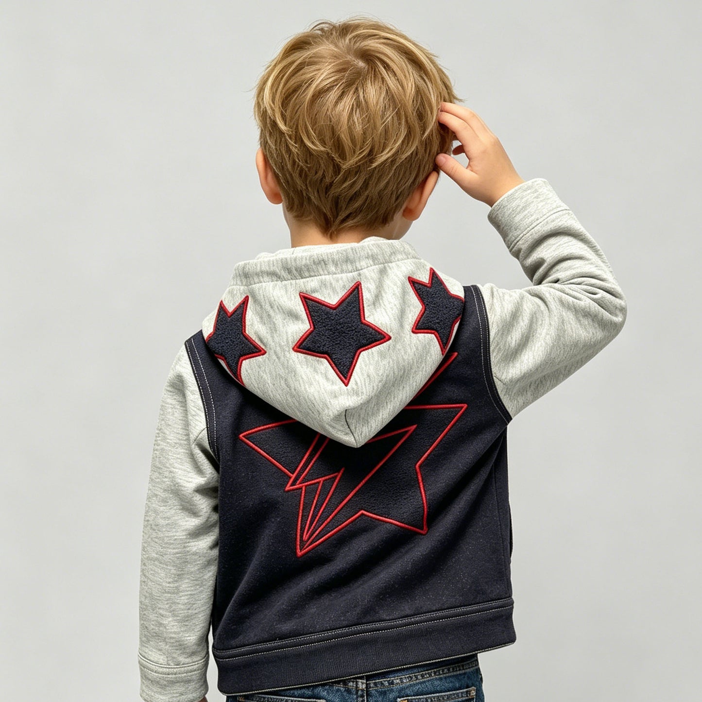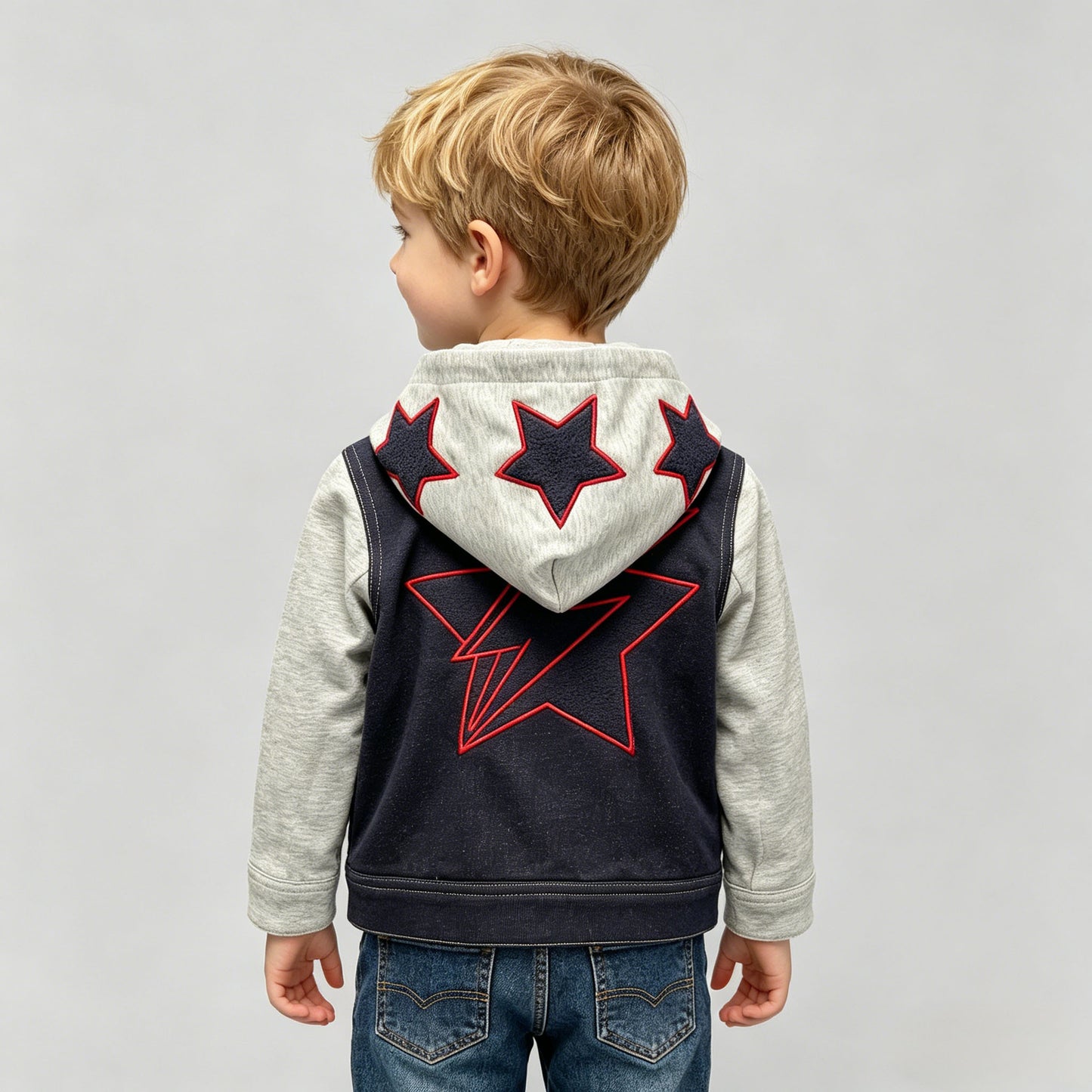 In the electric pulse of Times Square, where billboards blaze and the city never sleeps, a young boy strides confidently through the crowd. His knit denim hoodie jacket catches the light—bold navy stars outlined in red crown his hood, while a striking lightning-star design blazes across his back like a superhero’s insignia.